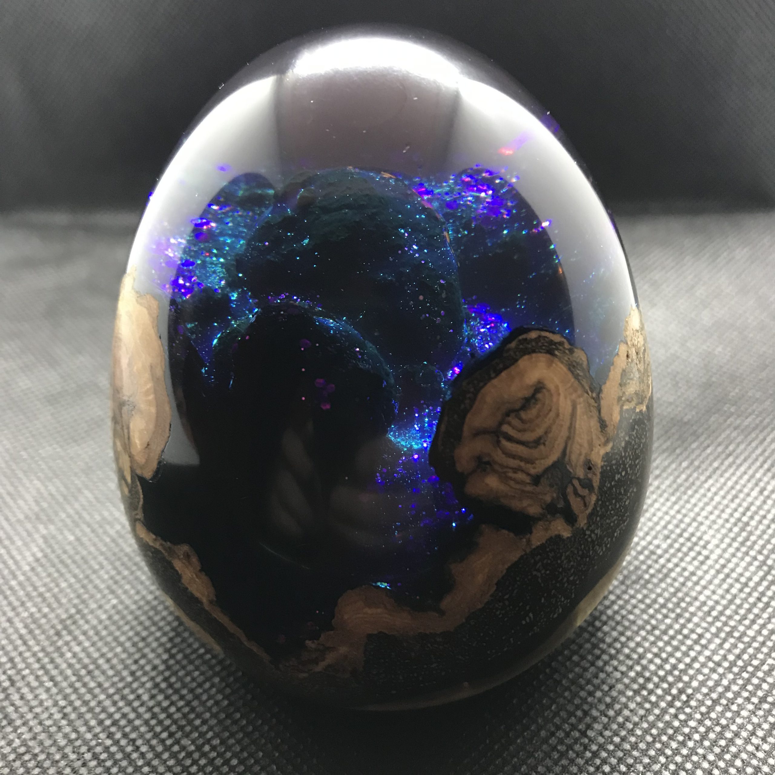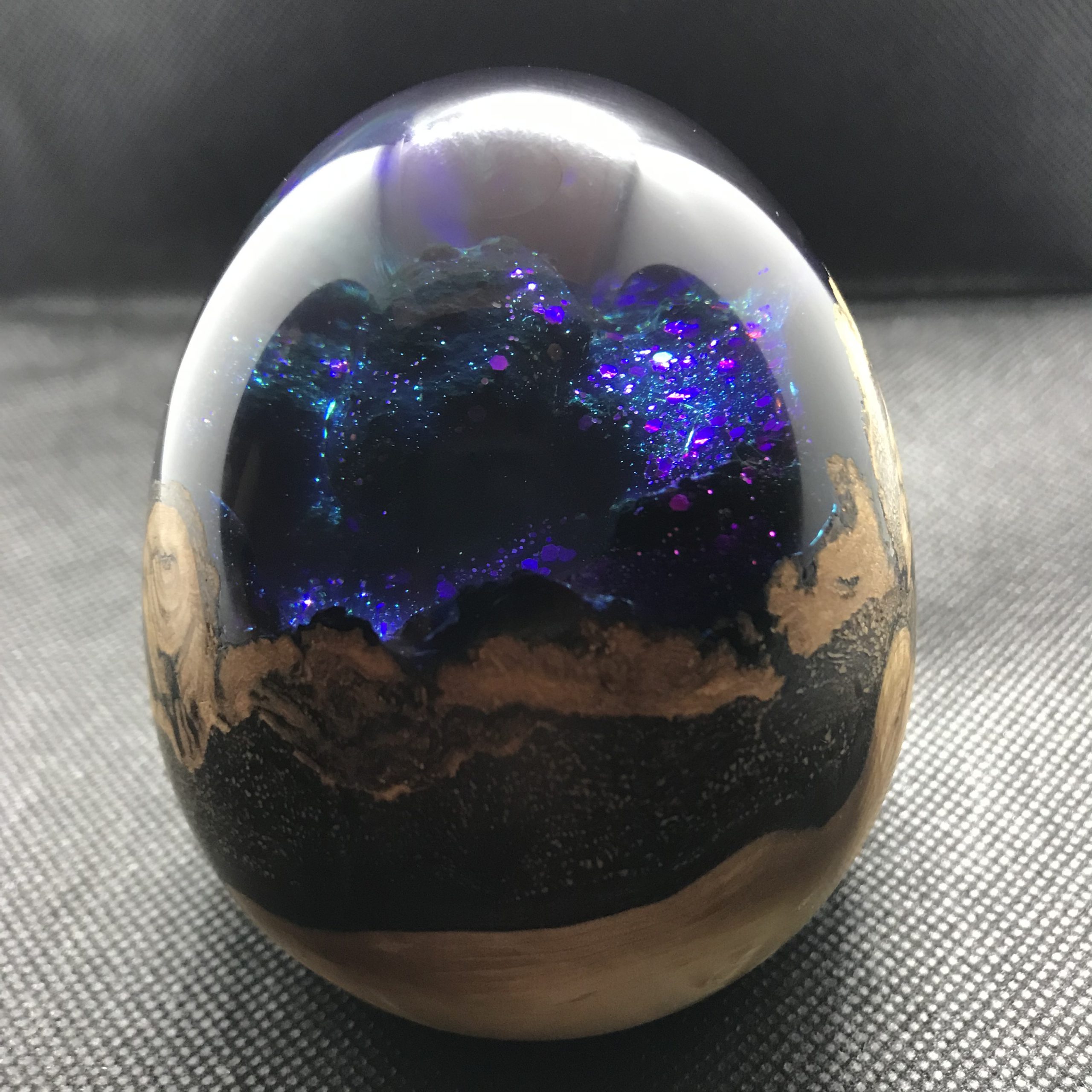 Jajo wykonane z narośli drzewnych i żywicy epoksydowej.